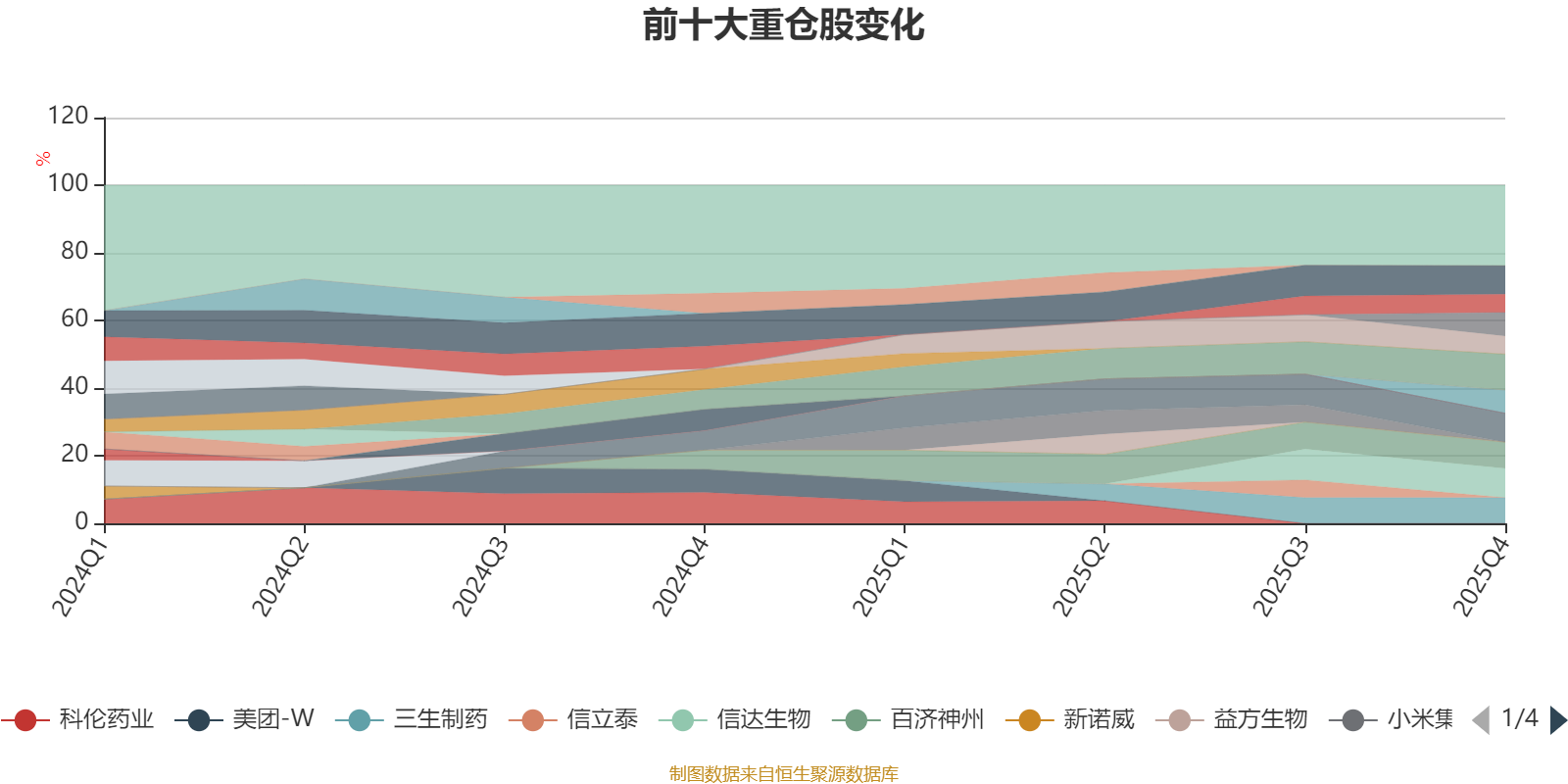 该基金持股集中度较高,近2年前十大重仓股集中度长期超过60%。截至2025年末,基金十大重仓股分别是腾讯控股、信达生物、科伦博泰生物-B、百利天恒、百济神州、三生制药、中际旭创、新易盛、恒瑞医药、诺诚健华。