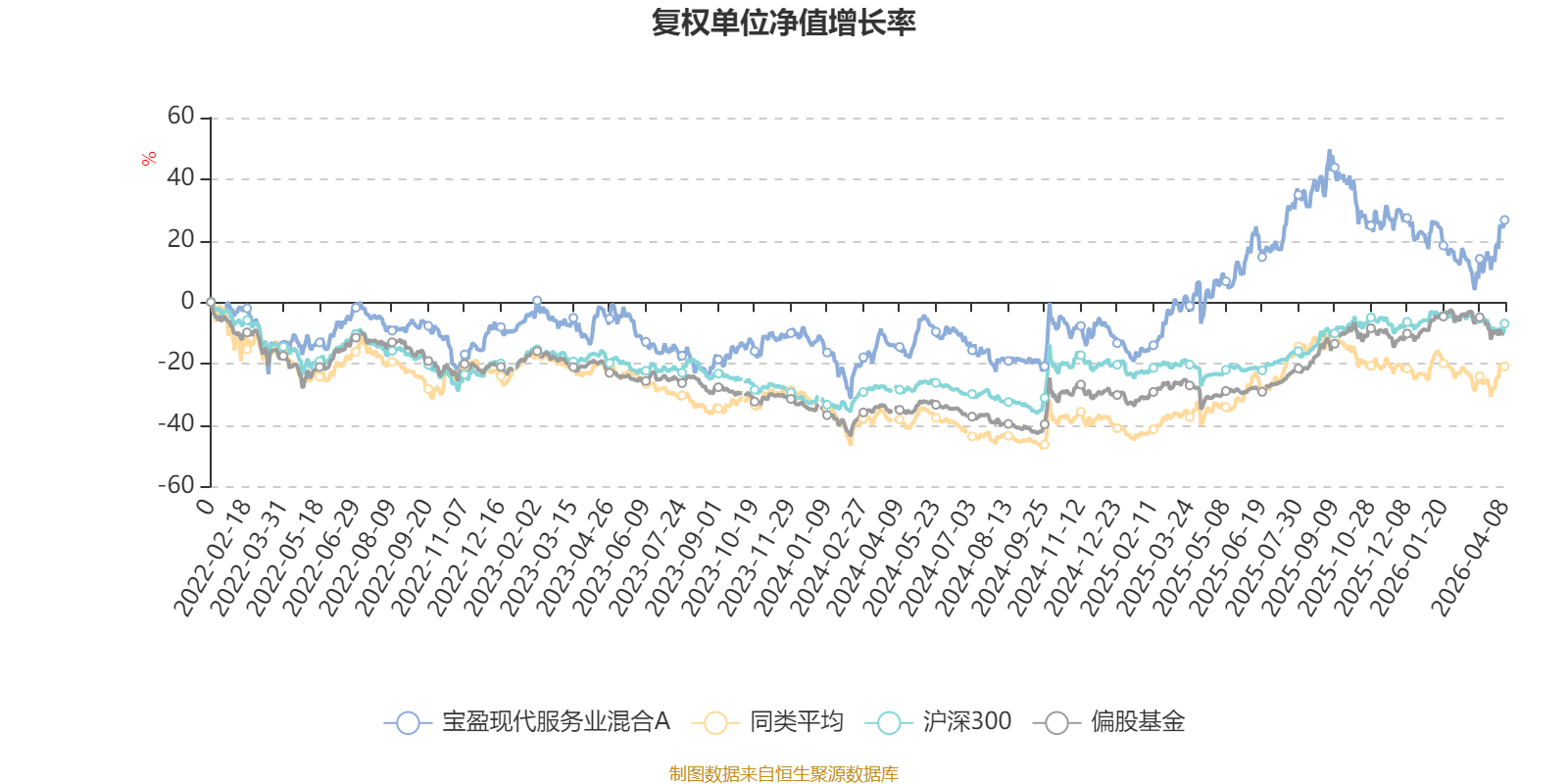 截至4月8日,宝盈现代服务业混合A近三个月复权单位净值增长率为1.24%,位于同类可比基金12/106;近半年复权单位净值增长率为-9.33%,位于同类可比基金48/106;近一年复权单位净值增长率为33.65%,位于同类可比基金41/104;近三年复权单位净值增长率为36.30%,位于同类可比基金7/78。