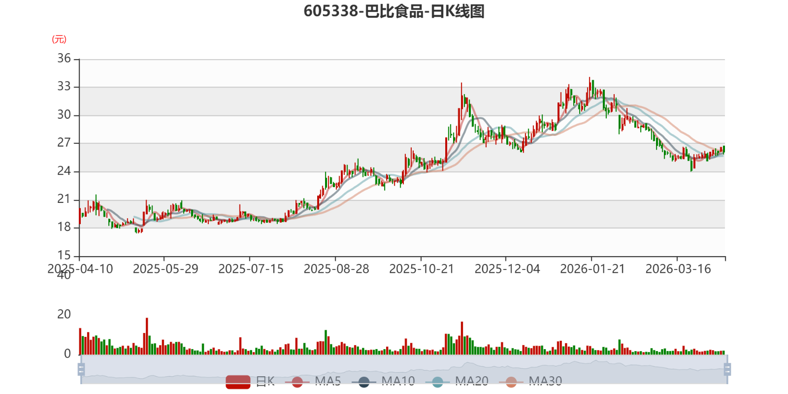 中证智能财讯巴比食品(605338)4月10日披露2025年年度报告。2025年,公司实现营业总收入18.59亿元,同比增长11.22%;归母净利润2.73亿元,同比下降1.28%;扣非净利润2.45亿元,同比增长16.66%;经营活动产生的现金流量净额为3.19亿元,同比增长46.93%;报告期内,巴比食品基本每股收益为1.14元,加权平均净资产收益率为11.97%。公司2025年度分配预案为:拟向全体股东每10股派现12元(含税)。