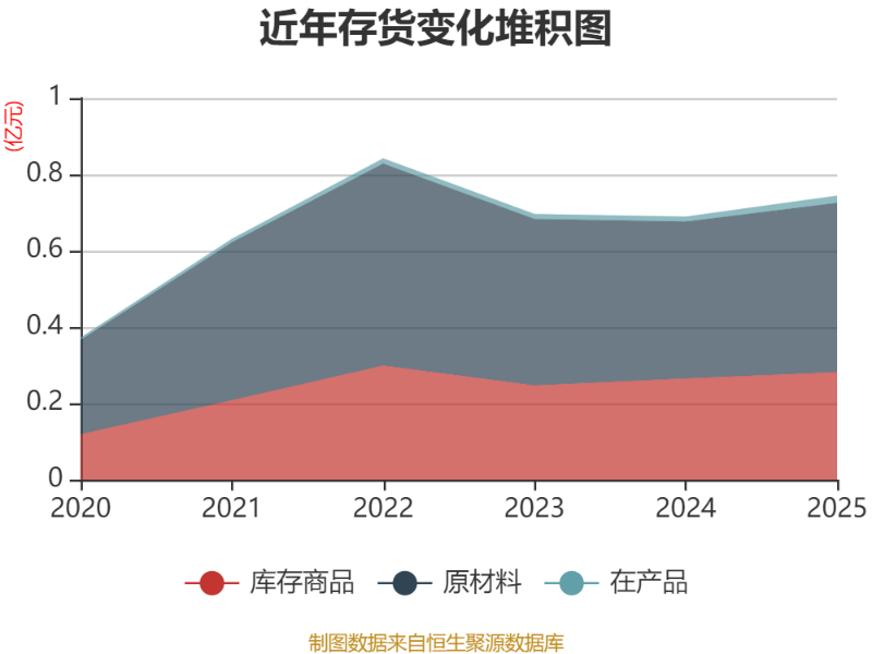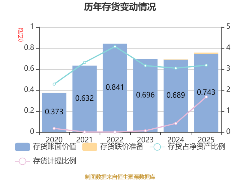 从存货变动来看,截至2025年末,公司存货账面价值为7433.55万元,占净资产的3.18%,较上年末增加546.73万元。其中,存货跌价准备为126.32万元,计提比例为1.67%。
