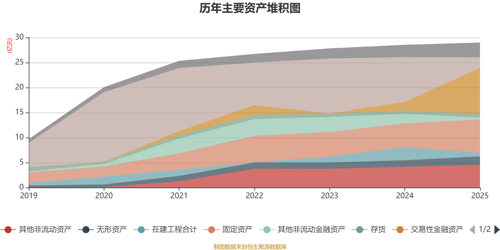 资产重大变化方面,截至2025年末,公司交易性金融资产合计较上年末增加431.01%,占公司总资产比重上升25.5个百分点;货币资金较上年末减少75.95%,占公司总资产比重下降23.92个百分点;在建工程合计较上年末减少72.08%,占公司总资产比重下降6.66个百分点;固定资产较上年末增加39.22%,占公司总资产比重上升6.2个百分点。