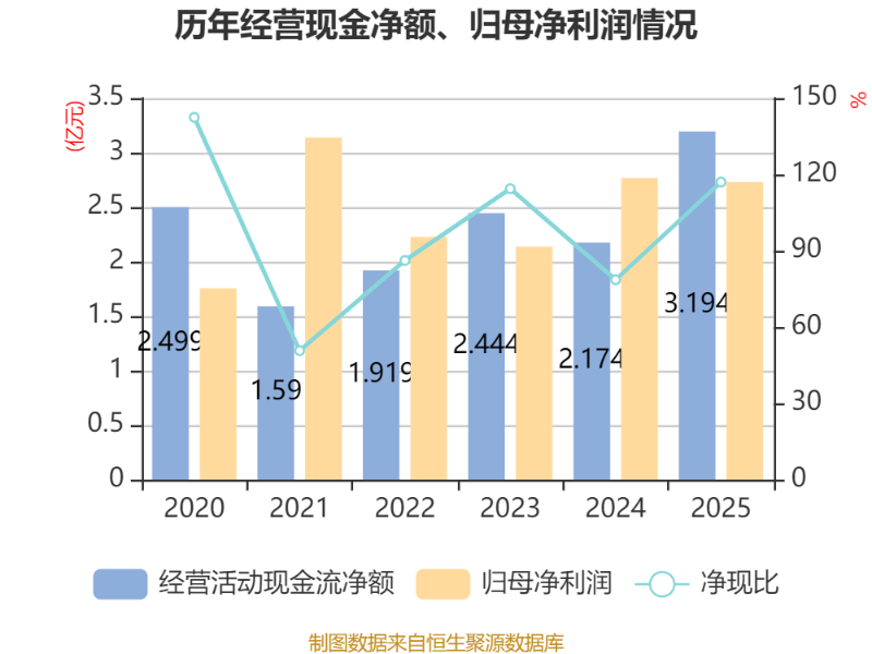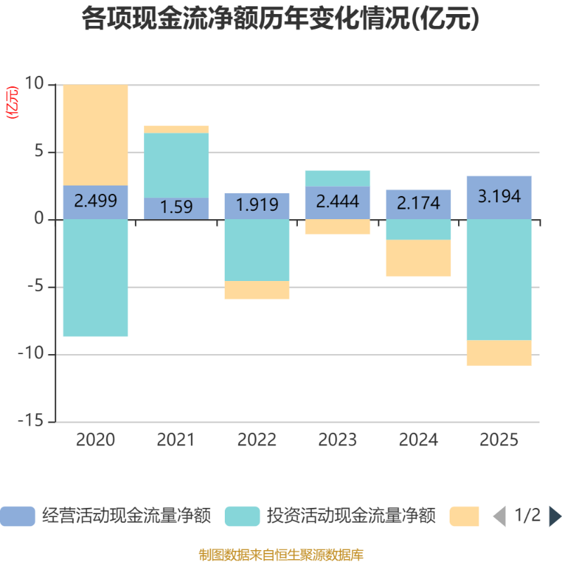 截至2025年,公司经营活动现金流净额为3.19亿元,同比增长46.93%;筹资活动现金流净额-1.88亿元,同比增加8227.34万元;投资活动现金流净额-8.98亿元,上年同期为-1.53亿元。