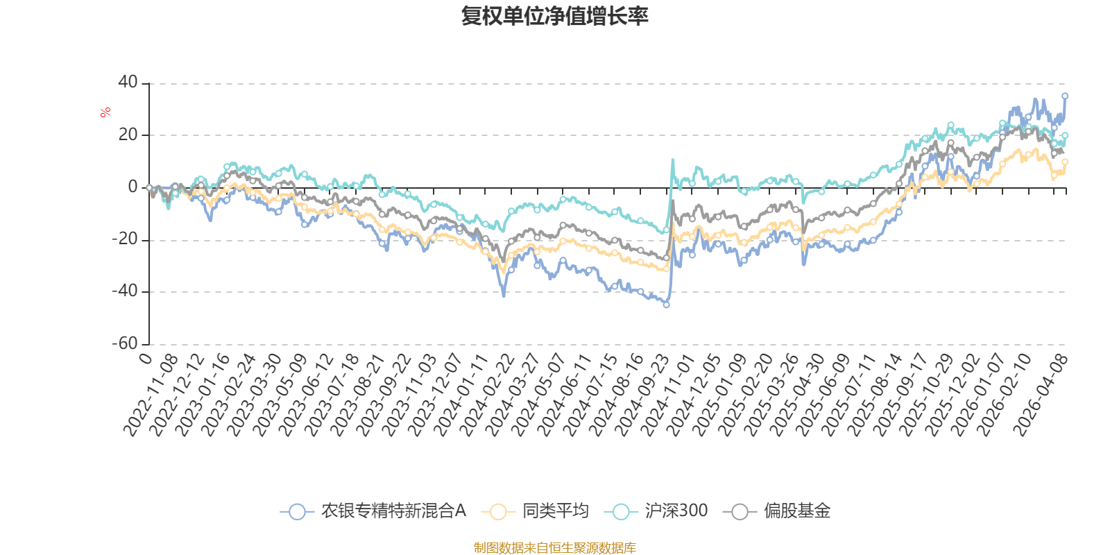 截至4月8日,农银专精特新混合A近三个月复权单位净值增长率为10.91%,位于同类可比基金54/689;近半年复权单位净值增长率为20.19%,位于同类可比基金58/689;近一年复权单位净值增长率为91.46%,位于同类可比基金50/685;近三年复权单位净值增长率为41.04%,位于同类可比基金68/417。