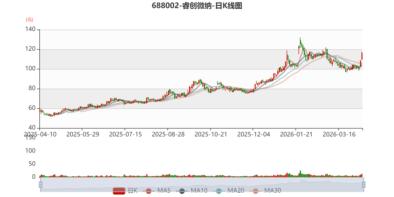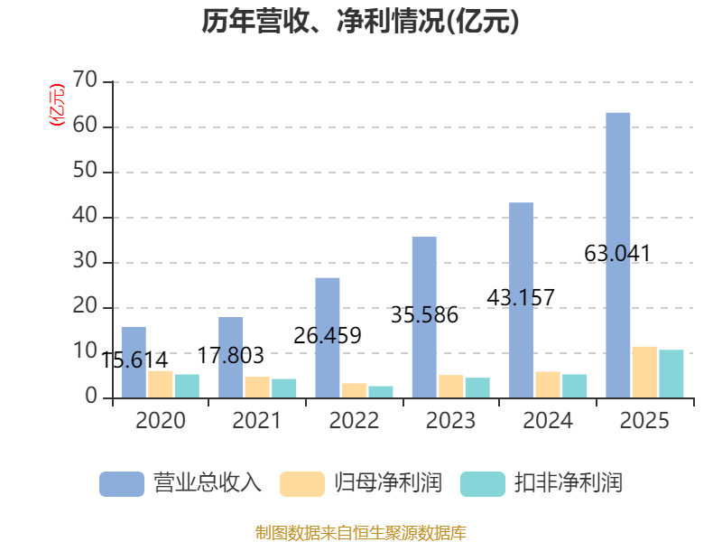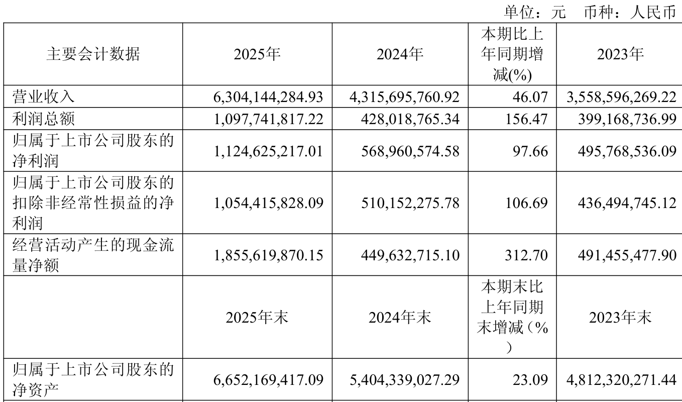 中证智能财讯睿创微纳(688002)4月10日披露2025年年度报告。2025年,公司实现营业总收入63.04亿元,同比增长46.07%;归母净利润11.25亿元,同比增长97.66%;扣非净利润10.54亿元,同比增长106.69%;经营活动产生的现金流量净额为18.56亿元,同比增长312.70%;报告期内,睿创微纳基本每股收益为2.5元,加权平均净资产收益率为18.68%。公司2025年度分配预案为:拟向全体股东每10股派现3元(含税)。