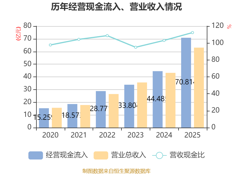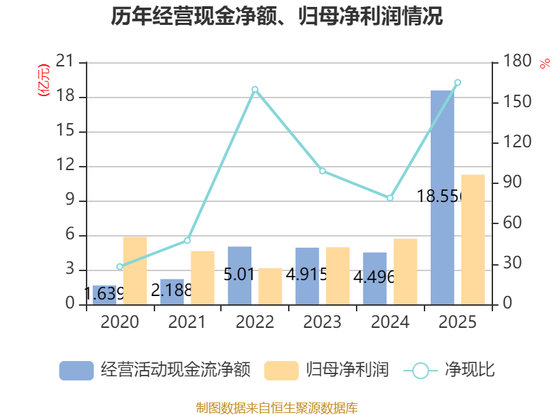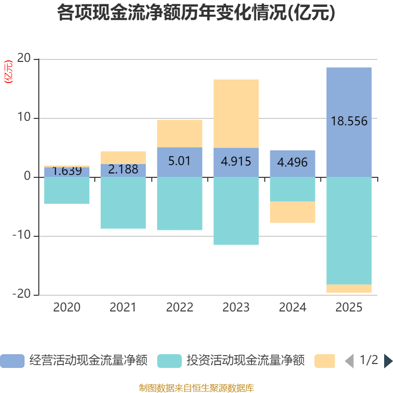 截至2025年,公司经营活动现金流净额为18.56亿元,同比增长312.7%;筹资活动现金流净额-1.39亿元,同比增加2.23亿元;投资活动现金流净额-18.26亿元,上年同期为-4.18亿元。