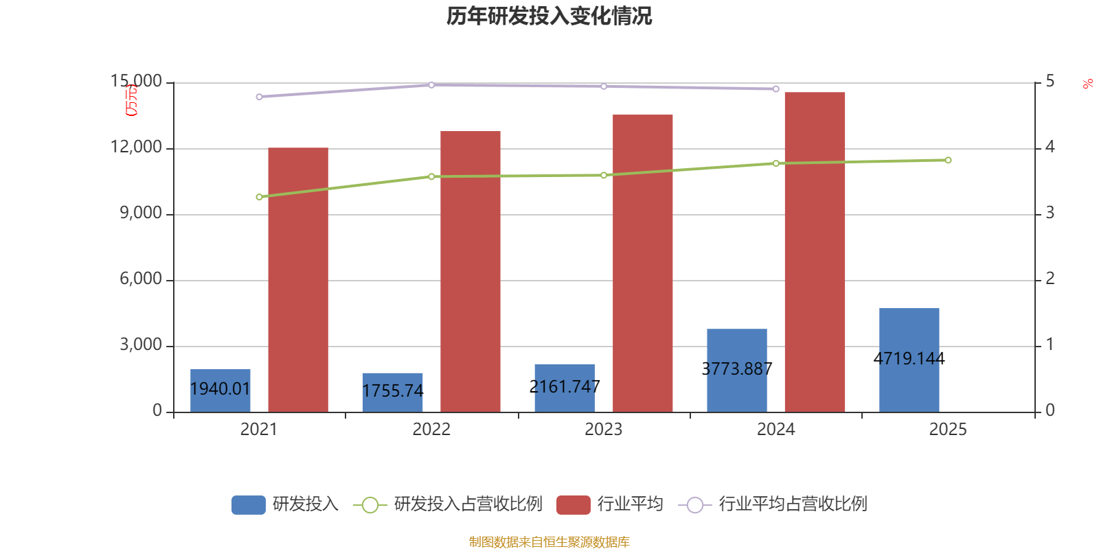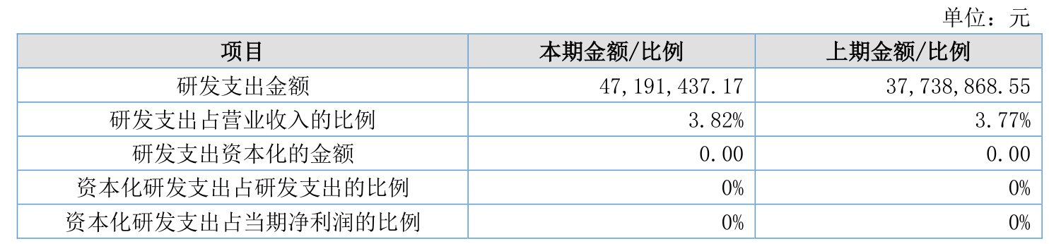 2025年全年,公司研发投入金额为4719.14万元,同比增长25.05%;研发投入占营业收入比例为3.82%,相比上年同期上升0.05个百分点。此外,公司全年研发投入资本化率为0%。
