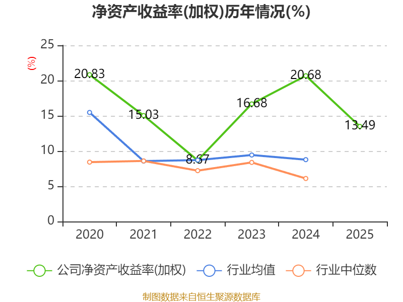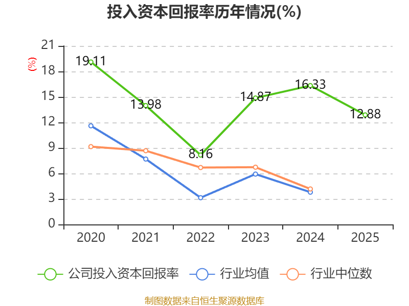数据显示,2025年公司加权平均净资产收益率为13.49%,较上年同期下降7.19个百分点。公司2025年投入资本回报率为12.88%,较上年同期下降3.45个百分点。