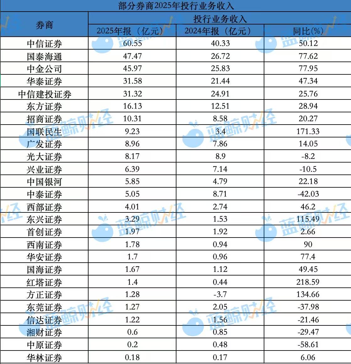 据Wind数据,从投行业务收入前十名来看,中信证券以60.55亿元稳居投行榜首,国泰海通、中金公司以47.47亿元、45.97亿元的投行收入紧随其后。