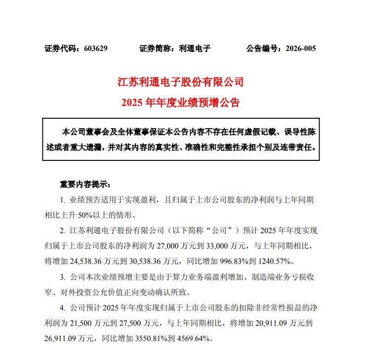 业绩方面,利通电子发布的2025年年度业绩预告显示,公司预计2025年全年实现归属于上市公司股东的净利润为2.70亿元至3.30亿元,同比增长996.83%至1240.57%。对于业绩增长的原因,公司解释称,主要是由于算力业务端盈利增加、制造端业务亏损收窄、对外投资公允价值正向变动确认所致。