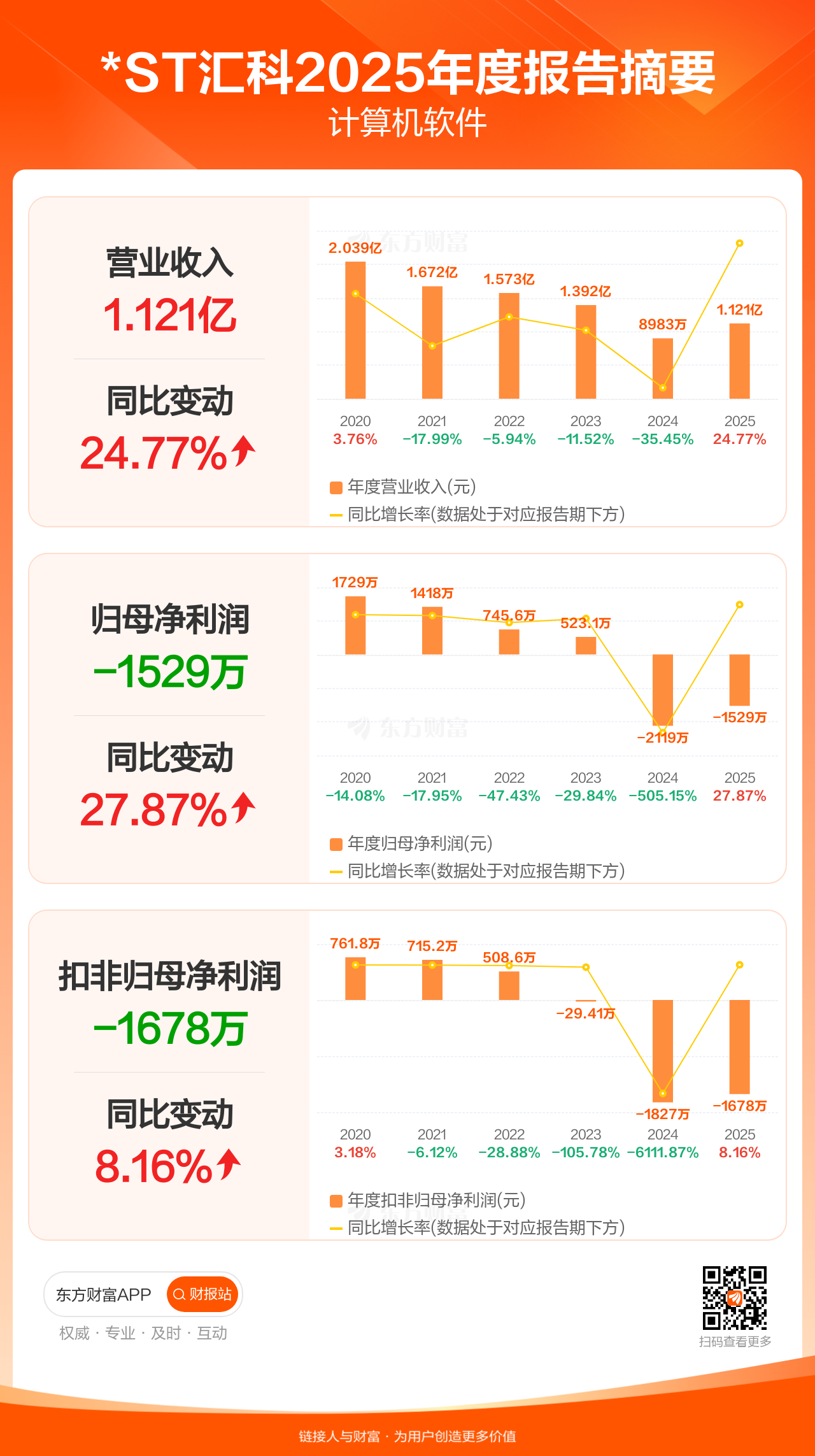 *ST汇科4月10日发布2025年年报显示,公司全年实现营业收入1.12亿元,同比增长24.77%;归母净利润-1528.73万元;扣非归母净利润-1677.65万元。