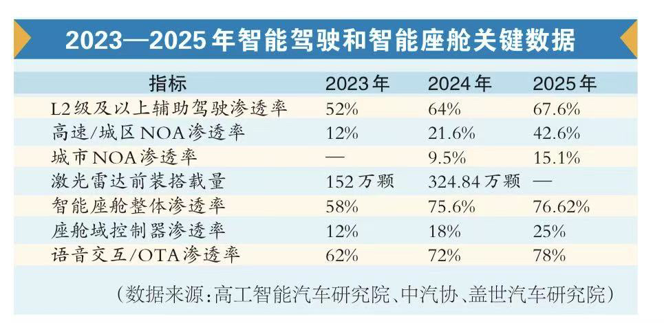 这些头部企业共同带动,使智能驾驶的普及速度超出了多数机构的早期预测。据高工智能汽车研究院统计,2025年前三季度,20万元以下价位车型合计标配NOA交付量达172.42万辆,贡献了整体NOA市场增量的近70%。同年,中国市场乘用车前装标配激光雷达搭载量达到324.84万颗,同比增长112.07%,渗透率突破20%。