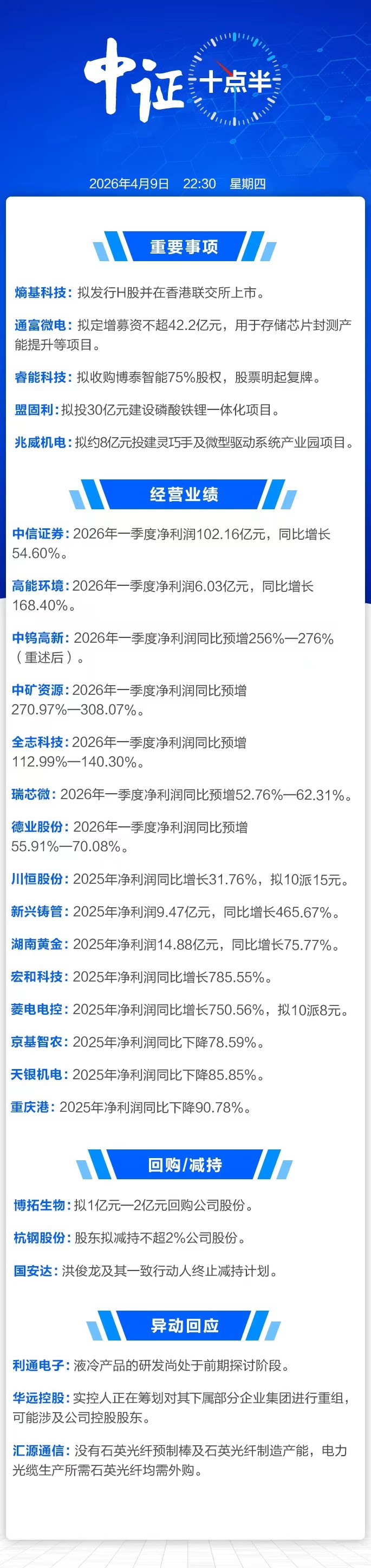 【中证十点半】通富微电拟募资不超42.2亿元;睿能科技明日复牌;中信证券一季度业绩出炉