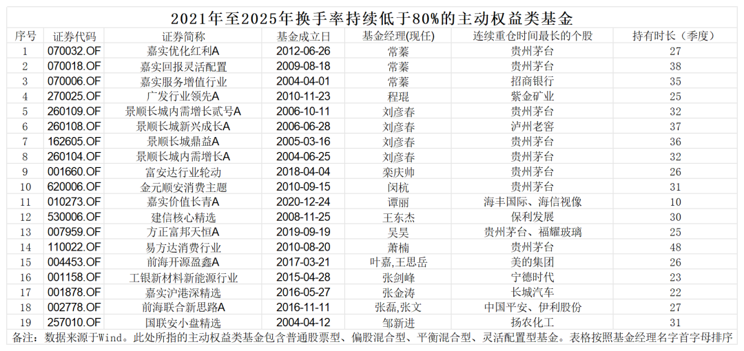 Wind数据统计,全市场4000余只(主代码口径)主动权益类基金中,2021年至2025年间,每年换手率均低于80%的基金仅有不到20只,占比不足0.5%。