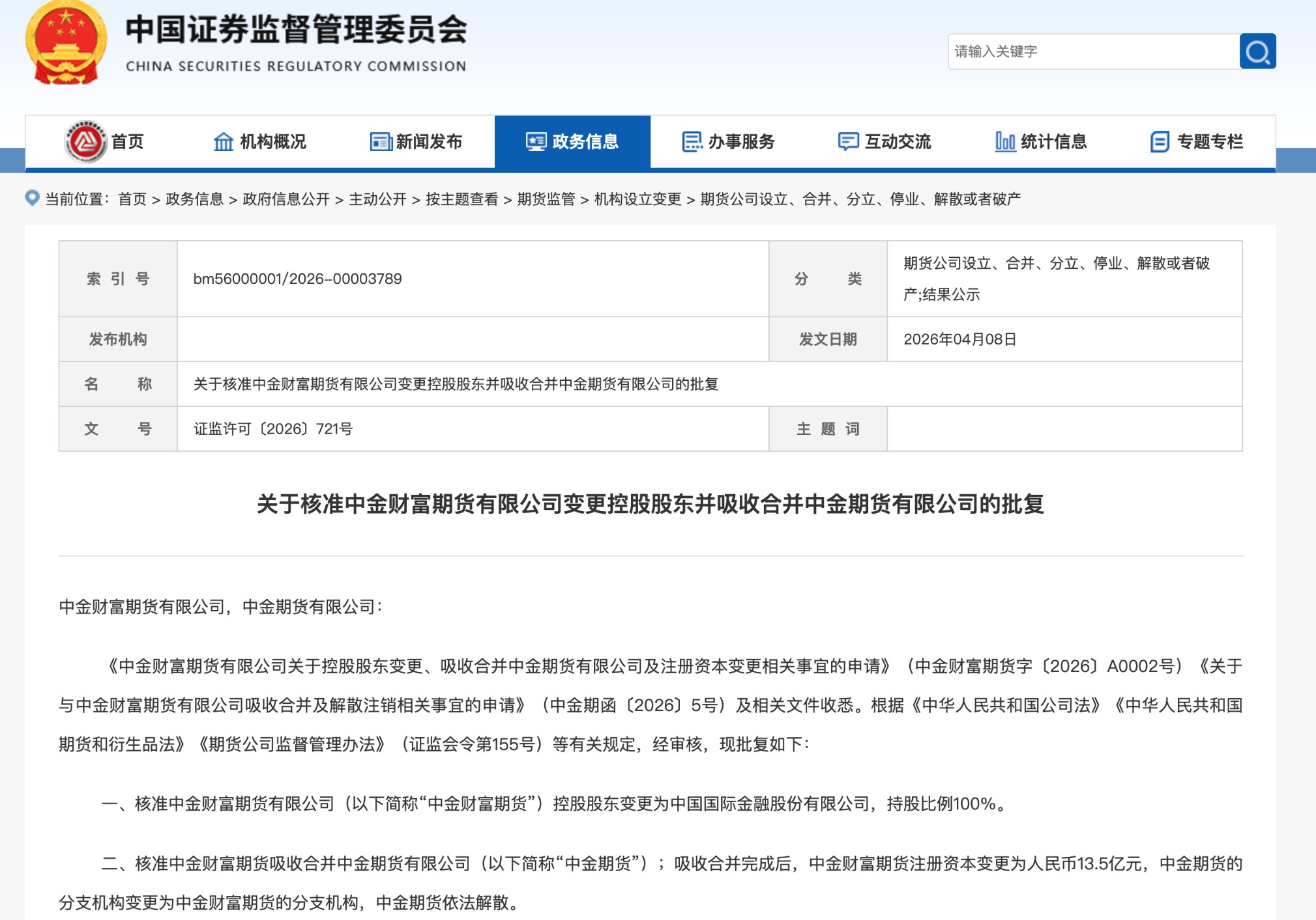 4月8日,证监会发布公告称,核准中金财富期货有限公司(以下简称“中金财富期货”)控股股东变更为中国国际金融股份有限公司(简称“中金公司”),持股比例100%。同时,核准中金财富期货吸收合并中金期货有限公司(以下简称“中金期货”)。吸收合并完成后,中金财富期货注册资本变更为人民币13.5亿元,中金期货的分支机构变更为中金财富期货的分支机构,中金期货依法解散。
