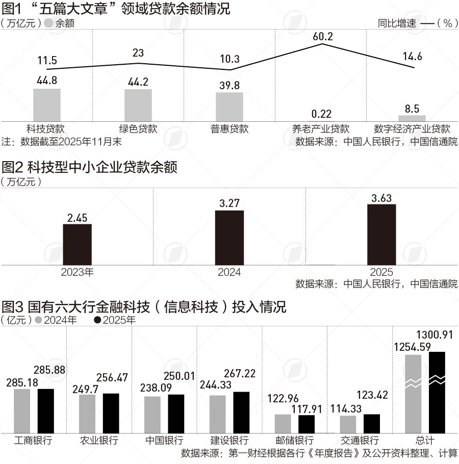 工商银行《2025年度报告》显示,“五篇大文章”等重点领域支持力度持续加大,投向制造业、普惠、科技创新领域的贷款分别增长19.4%、22.8%和19.9%。2025 年末科技贷款余额6 万亿元,较年初增长近1万亿元。