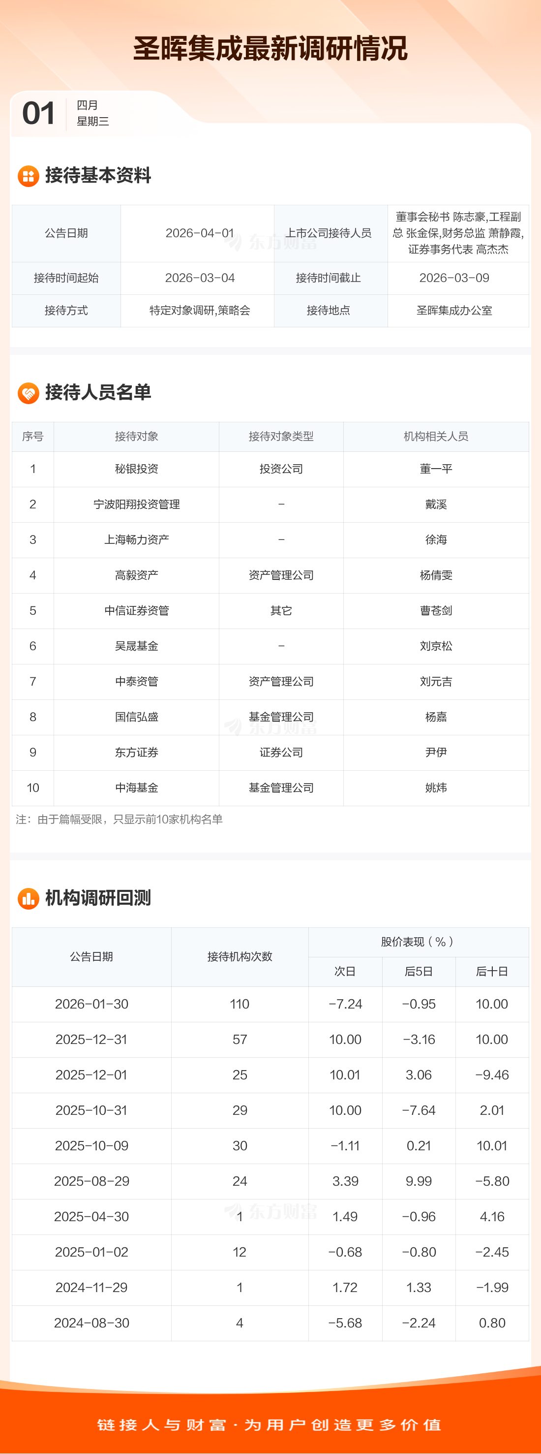 圣晖集成4月1日公告称,3月4日至3月9日接待秘银投资等51家机构调研。接待人员包括董事会秘书 陈志豪,工程副总 张金保,财务总监 萧静霞,证券事务代表 高杰杰。