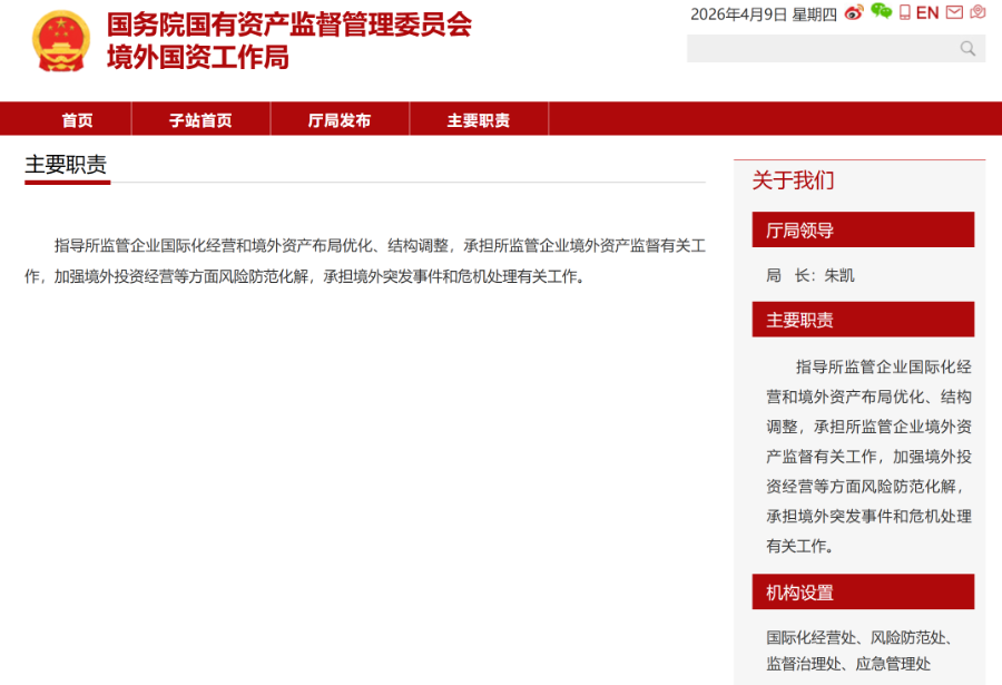 据国务院国资委官网信息,境外国资工作局首任局长由朱凯担任,设置四大核心处室,分别为国际化经营处、风险防范处、监督治理处、应急管理处,构建起从经营指导、布局优化,到风险防控、监督问责、危机处置的全链条、全周期境外国资管理体系。