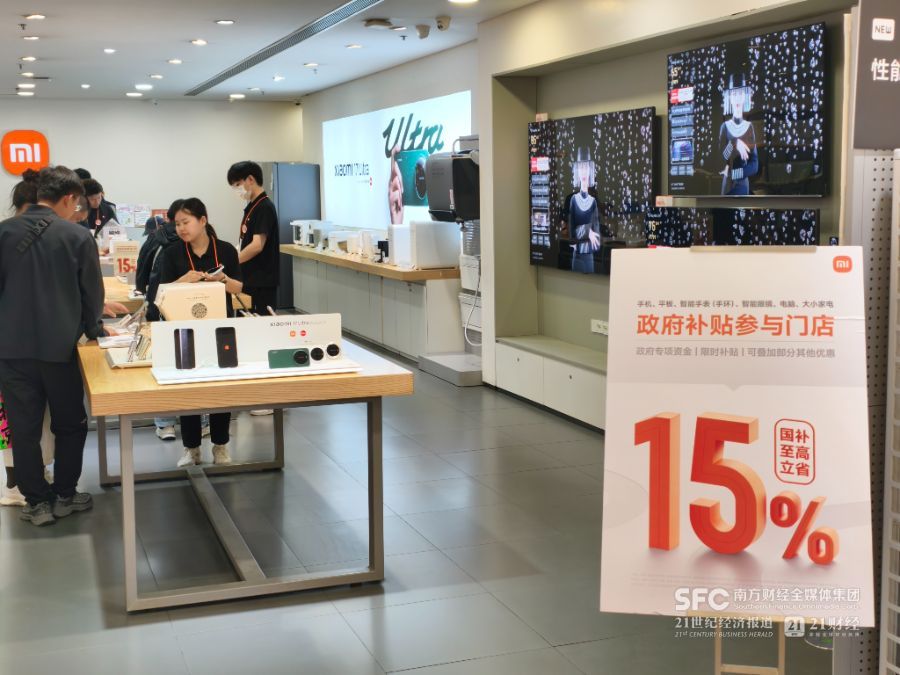 市场对以旧换新带动绿色智能消费的反馈非常直接。21世纪经济报道记者近日走访了北京多个商场,发现在西城区的华为和小米门店,15%国补的标志均被放在显著位置。