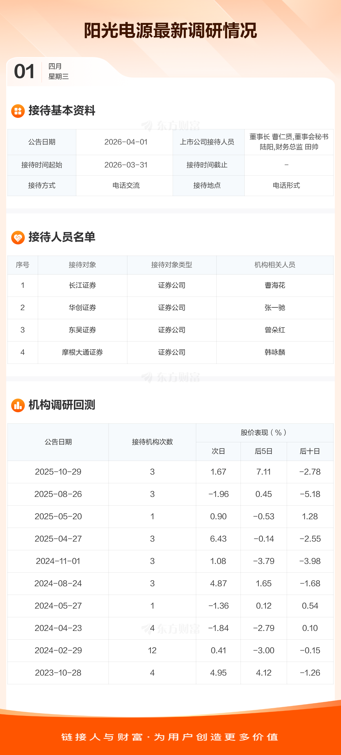 阳光电源4月1日公告称,3月31日接待长江证券等4家机构调研。接待人员包括董事长 曹仁贤,董事会秘书 陆阳,财务总监 田帅。