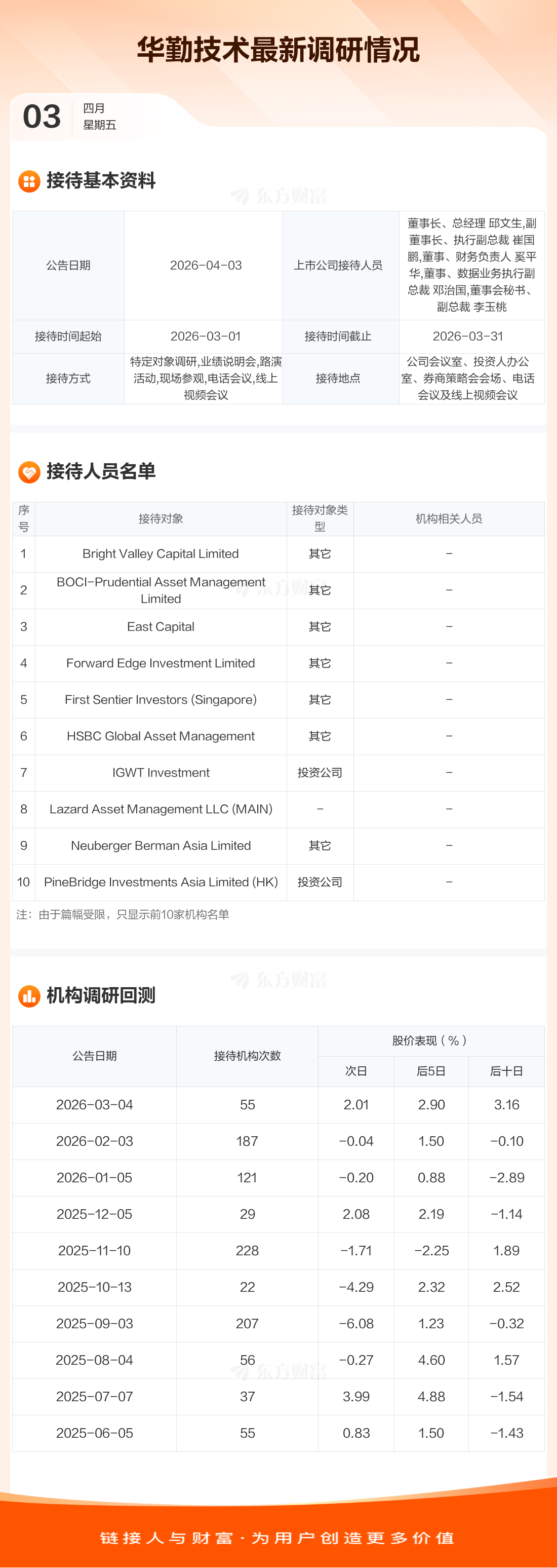 华勤技术4月3日公告称,3月1日至3月31日接待Bright Valley Capital Limited等219家机构调研。接待人员包括董事长、总经理 邱文生,副董事长、执行副总裁 崔国鹏,董事、财务负责人 奚平华,董事、数据业务执行副总裁 邓治国,董事会秘书、副总裁 李玉桃。