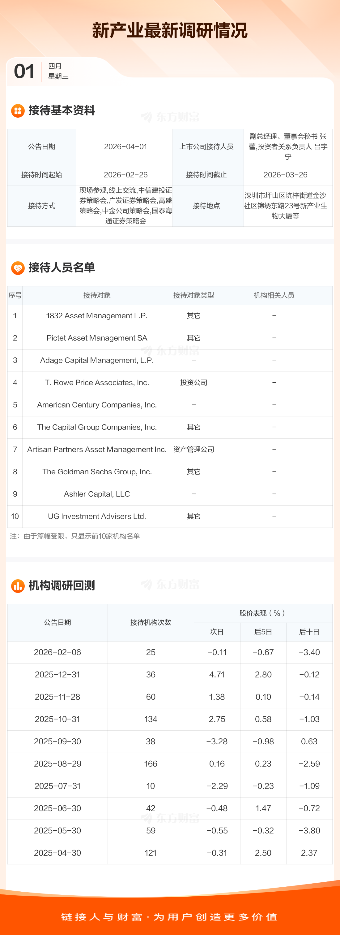新产业4月1日公告称,2月26日至3月26日接待1832 Asset Management L.P.等29家机构调研。接待人员包括副总经理、董事会秘书 张蕾,投资者关系负责人 吕宇宁。
