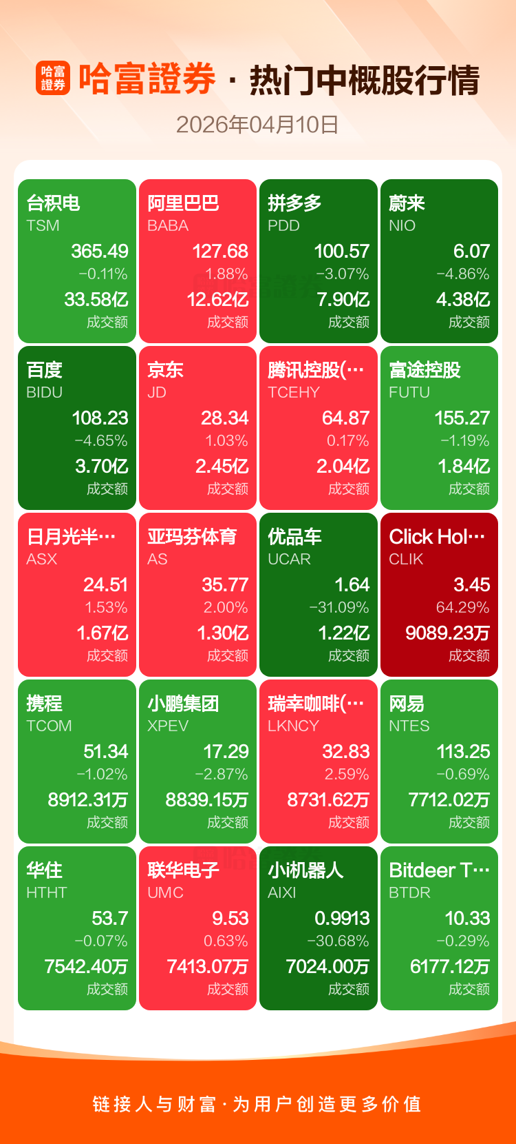 台积电跌0.11%,阿里巴巴涨1.88%,拼多多跌3.07%,蔚来跌4.86%,百度跌4.65%,京东涨1.03%,腾讯控股(ADR)涨0.17%,富途控股跌1.19%,日月光半导体涨1.53%,亚玛芬体育涨2.00%。