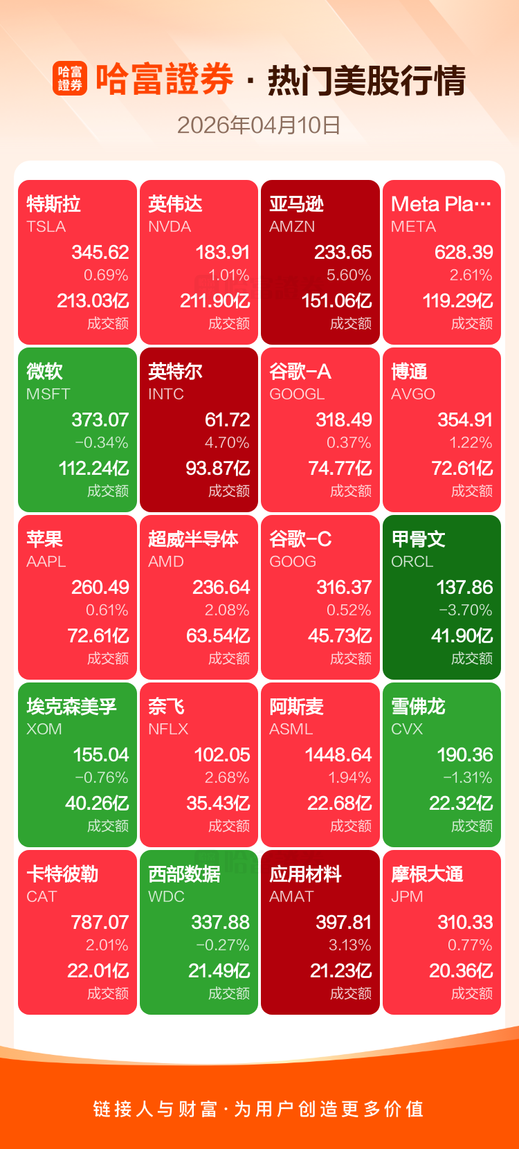 特斯拉涨0.69%,英伟达涨1.01%,亚马逊涨5.60%,Meta Platforms Inc-A涨2.61%,微软跌0.34%,英特尔涨4.70%,谷歌-A涨0.37%,博通涨1.22%,苹果涨0.61%,超威半导体涨2.08%。