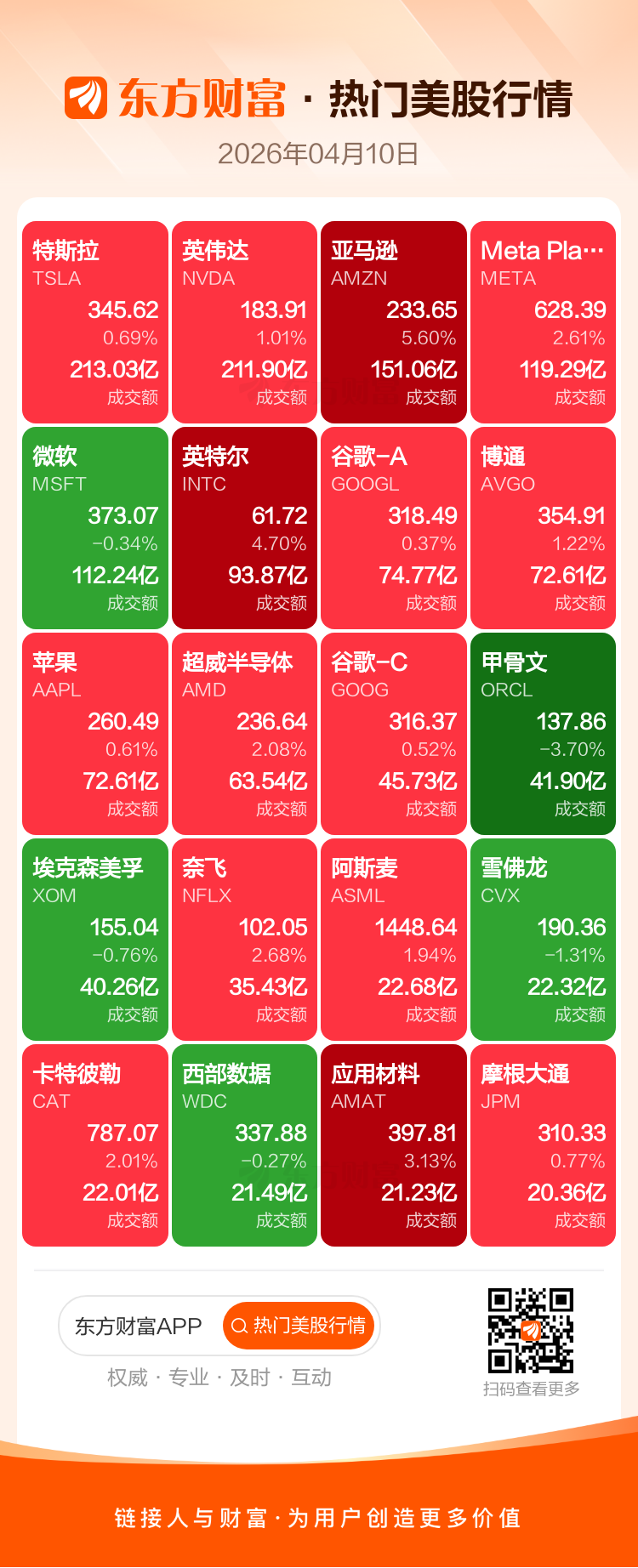 特斯拉涨0.69%,英伟达涨1.01%,亚马逊涨5.60%,Meta Platforms Inc-A涨2.61%,微软跌0.34%,英特尔涨4.70%,谷歌-A涨0.37%,博通涨1.22%,苹果涨0.61%,超威半导体涨2.08%。