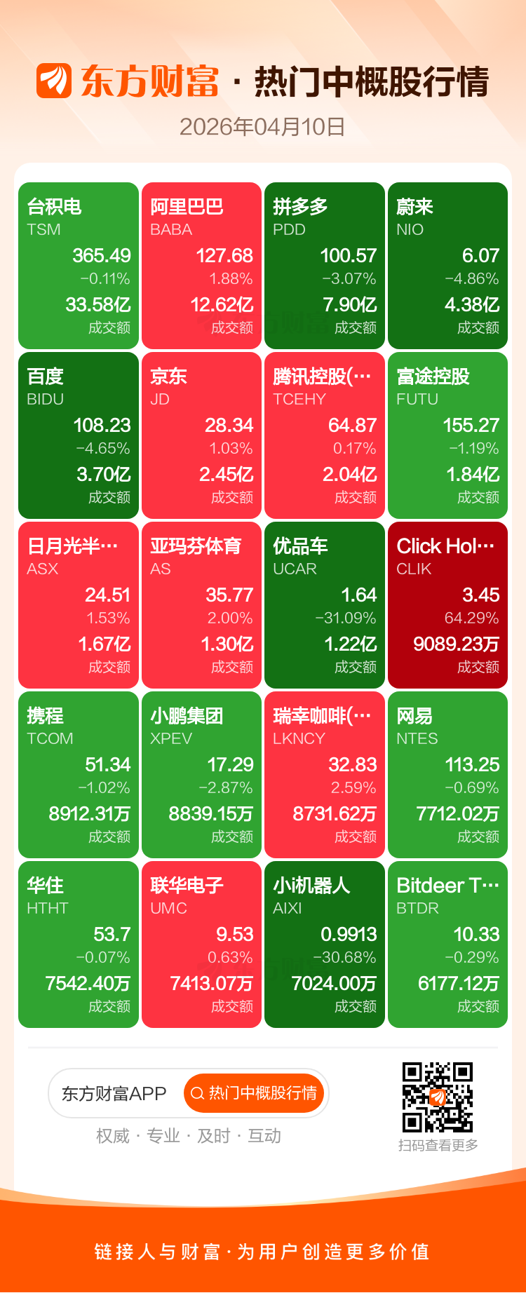 台积电跌0.11%,阿里巴巴涨1.88%,拼多多跌3.07%,蔚来跌4.86%,百度跌4.65%,京东涨1.03%,腾讯控股(ADR)涨0.17%,富途控股跌1.19%,日月光半导体涨1.53%,亚玛芬体育涨2.00%。