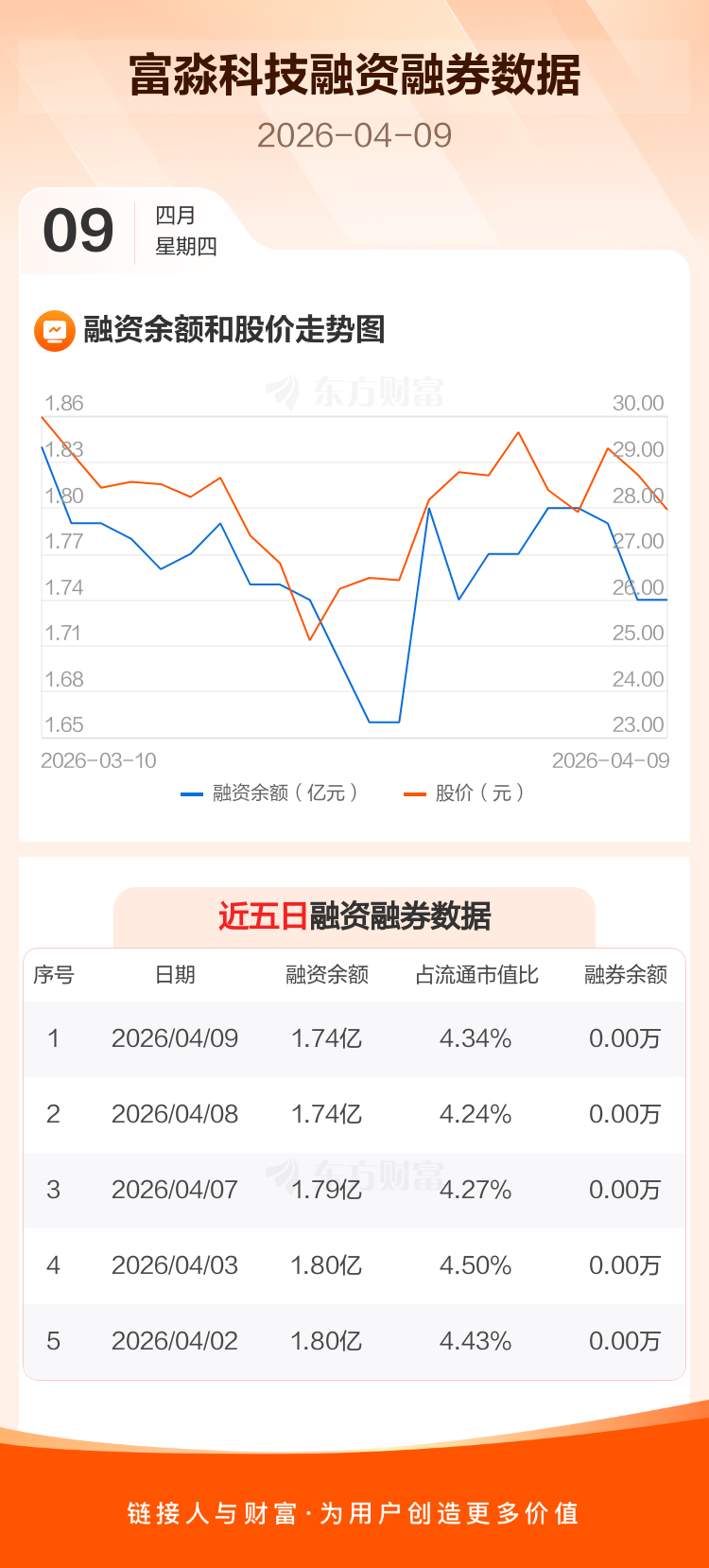 交易所最新数据显示,富淼科技于2026年4月9日获融资买入2197.45万元,融资偿还2256.97万元,当日融资净偿还59.52万元。目前,该股融资余额1.74亿,占流通市值比例为4.34%。