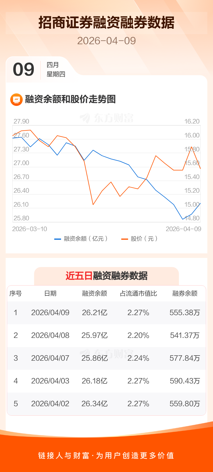 交易所最新数据显示,招商证券于2026年4月9日获融资买入6605.37万元,融资偿还4189.45万元,当日融资净买入2415.92万元。目前,该股融资余额26.21亿,占流通市值比例为2.27%。