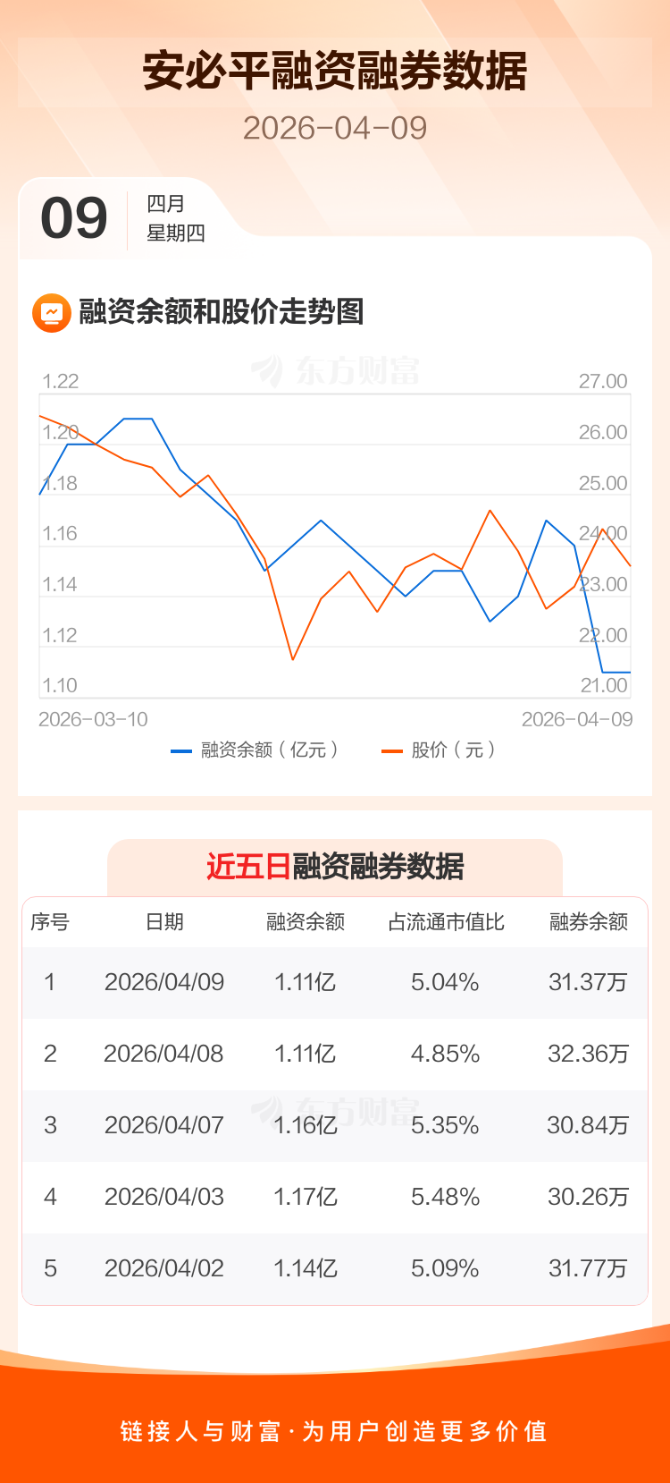交易所最新数据显示,安必平于2026年4月9日获融资买入289.21万元,融资偿还222.25万元,当日融资净买入66.96万元。目前,该股融资余额1.11亿,占流通市值比例为5.04%。