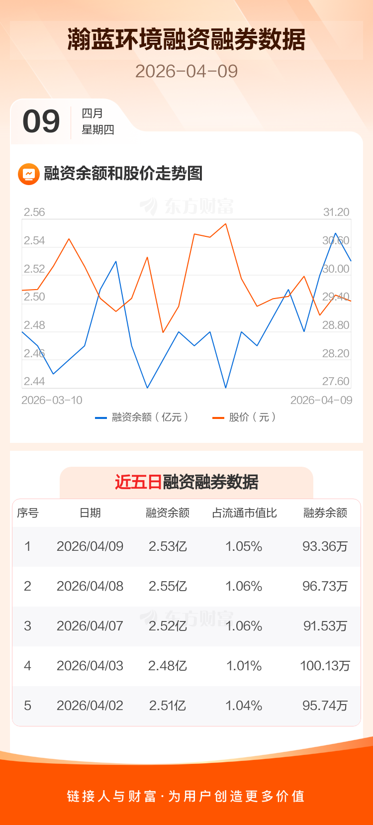 交易所最新数据显示,瀚蓝环境于2026年4月9日获融资买入561.27万元,融资偿还836.08万元,当日融资净偿还274.81万元。目前,该股融资余额2.53亿,占流通市值比例为1.05%。