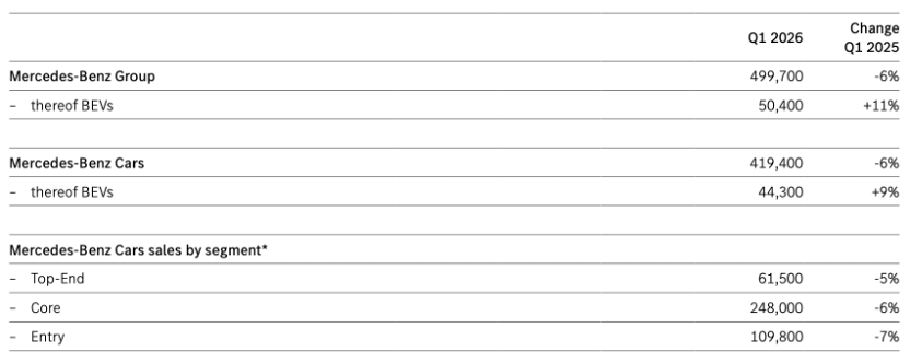 4月9日,梅赛德斯-奔驰集团在官网发布2026年第一季度销量报告。数据显示,该集团第一季度全球销量为49.97万辆,同比下滑6%。其中,梅赛德斯-奔驰乘用车业务全球销量为41.94万辆,同比下降6%,符合该公司预期。
