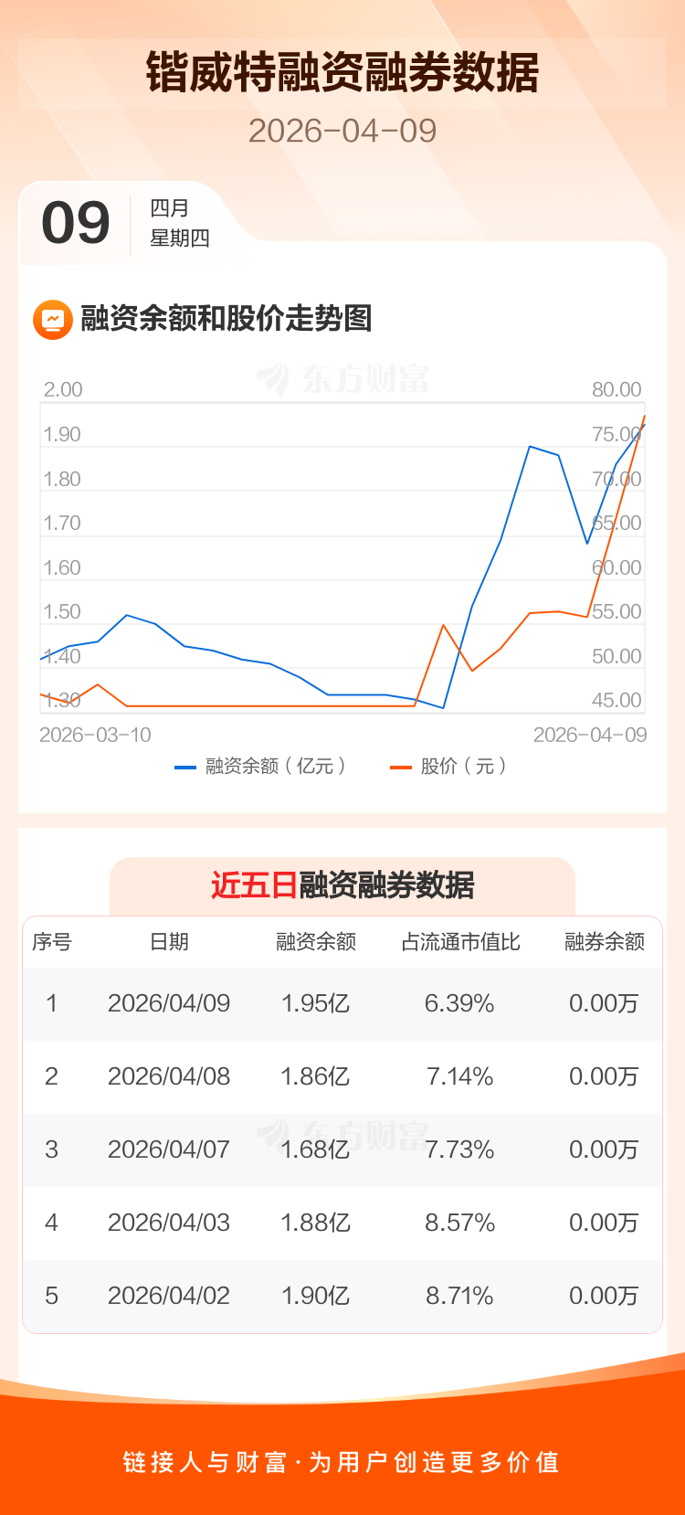交易所最新数据显示,锴威特于2026年4月9日获融资买入9302.79万元,融资偿还8382.95万元,当日融资净买入919.83万元。目前,该股融资余额1.95亿,占流通市值比例为6.39%。
