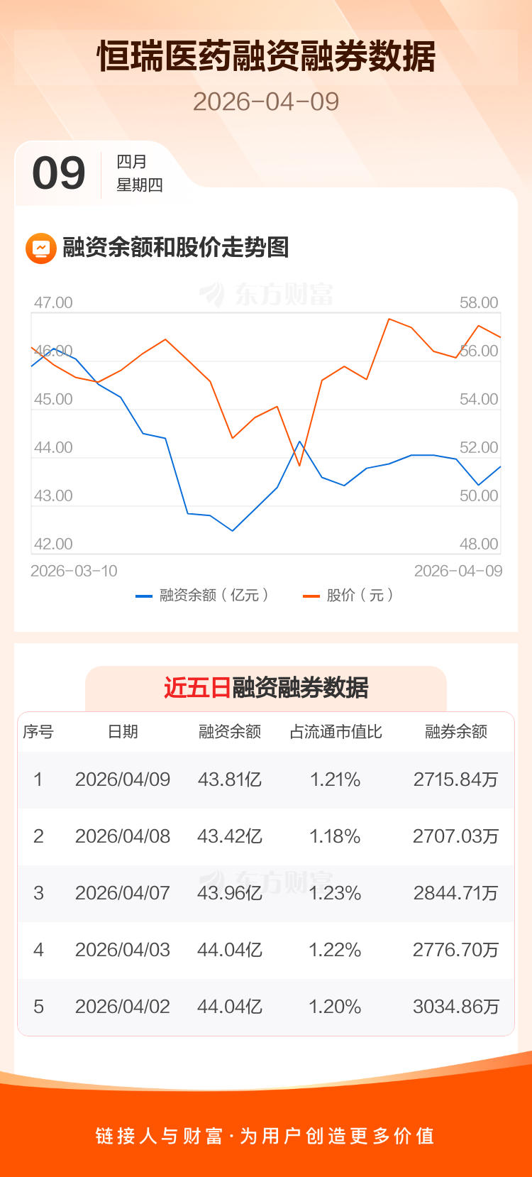 交易所最新数据显示,恒瑞医药于2026年4月9日获融资买入1.80亿元,融资偿还1.41亿元,当日融资净买入3903.64万元。目前,该股融资余额43.81亿,占流通市值比例为1.21%。
