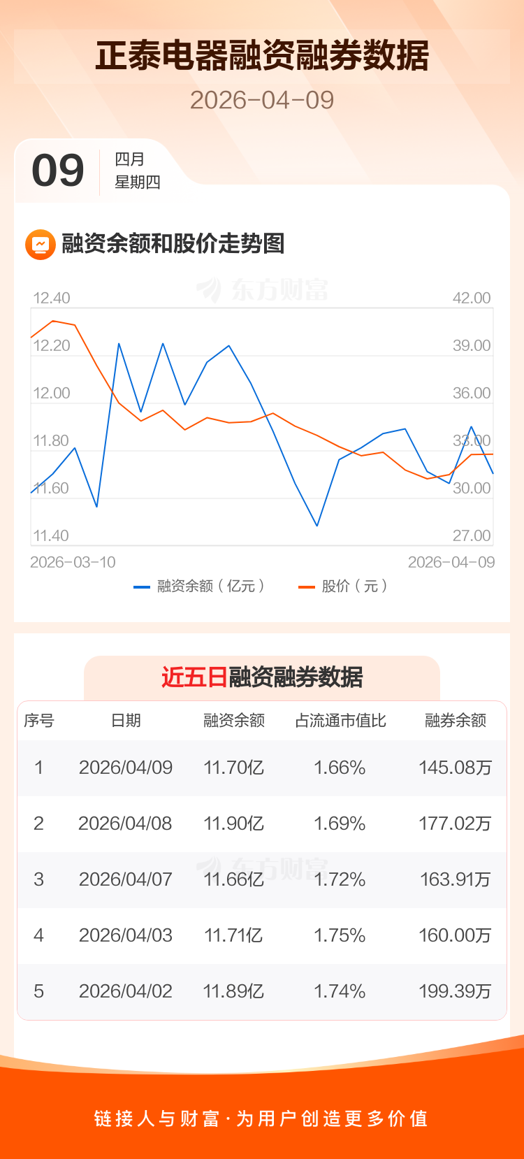 交易所最新数据显示,正泰电器于2026年4月9日获融资买入6200.28万元,融资偿还8163.43万元,当日融资净偿还1963.15万元。目前,该股融资余额11.70亿,占流通市值比例为1.66%。