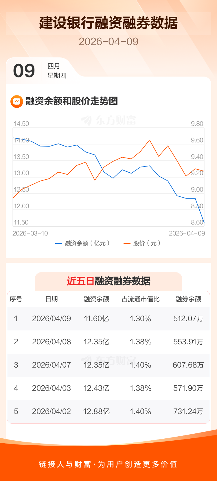交易所最新数据显示,建设银行于2026年4月9日获融资买入2654.55万元,融资偿还1.02亿元,当日融资净偿还7499.16万元。目前,该股融资余额11.60亿,占流通市值比例为1.30%。