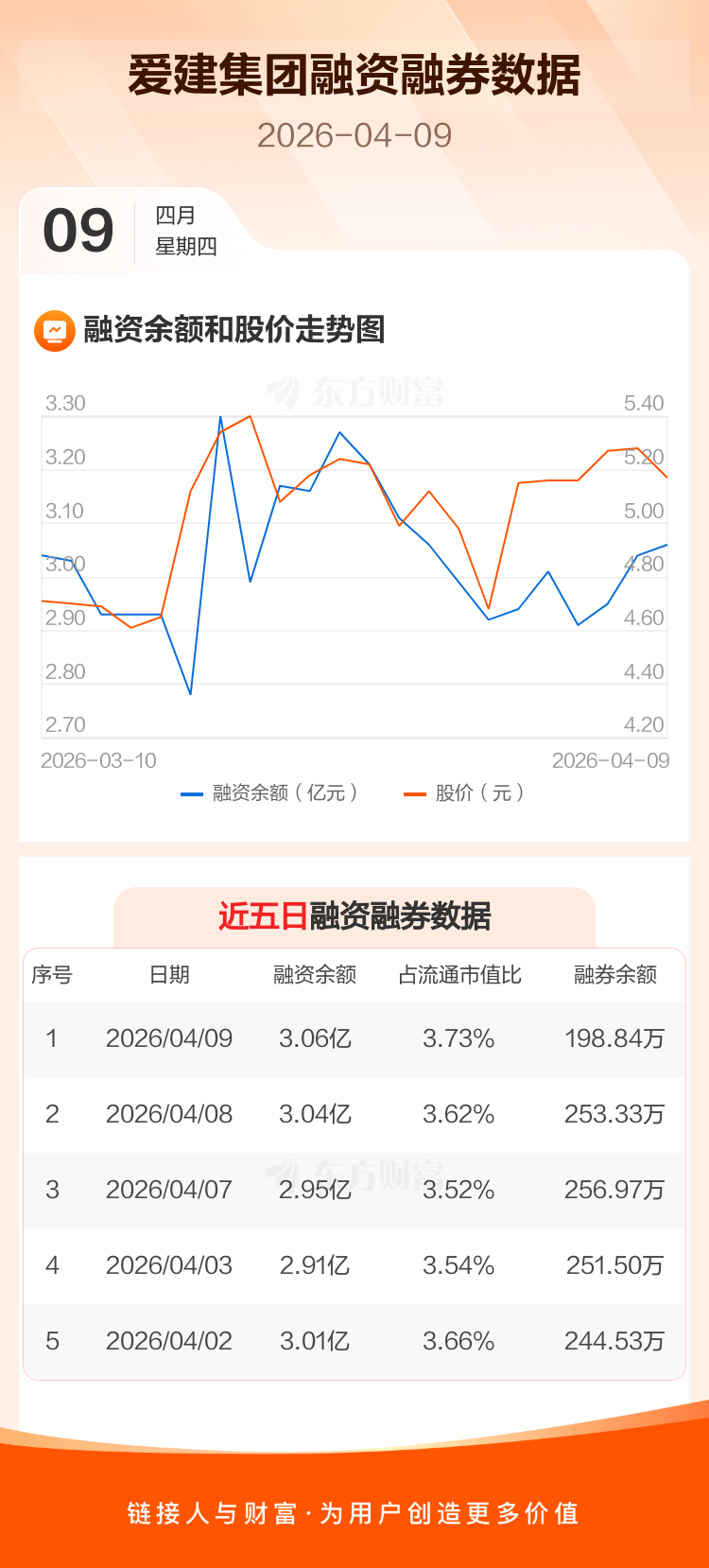 交易所最新数据显示,爱建集团于2026年4月9日获融资买入2230.30万元,融资偿还2007.17万元,当日融资净买入223.13万元。目前,该股融资余额3.06亿,占流通市值比例为3.73%。