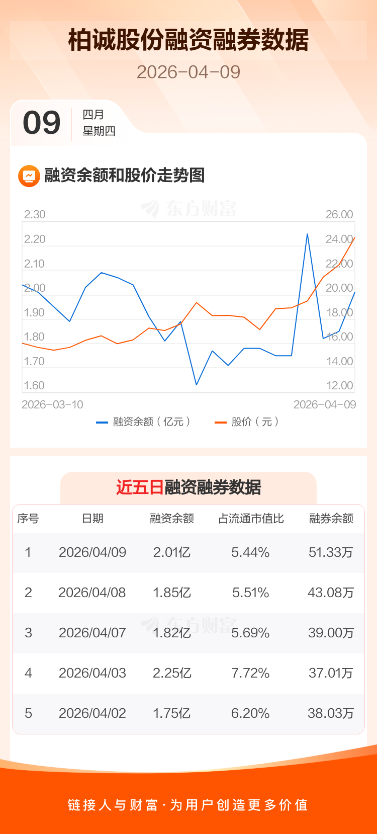 交易所最新数据显示,柏诚股份于2026年4月9日获融资买入9234.13万元,融资偿还7623.30万元,当日融资净买入1610.83万元。目前,该股融资余额2.01亿,占流通市值比例为5.44%。