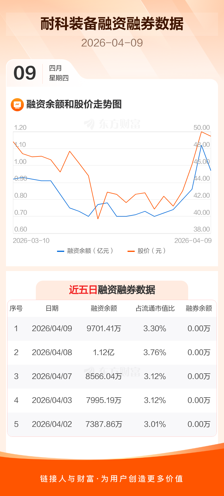 交易所最新数据显示,耐科装备于2026年4月9日获融资买入2327.39万元,融资偿还3814.26万元,当日融资净偿还1486.87万元。目前,该股融资余额9701.41万,占流通市值比例为3.30%。