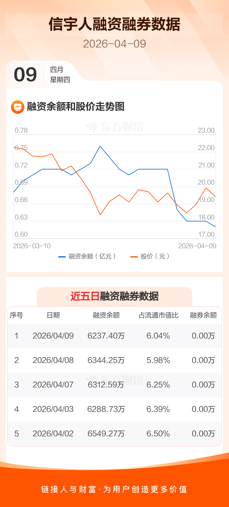 交易所最新数据显示,信宇人于2026年4月9日获融资买入238.06万元,融资偿还344.91万元,当日融资净偿还106.85万元。目前,该股融资余额6237.40万,占流通市值比例为6.04%。