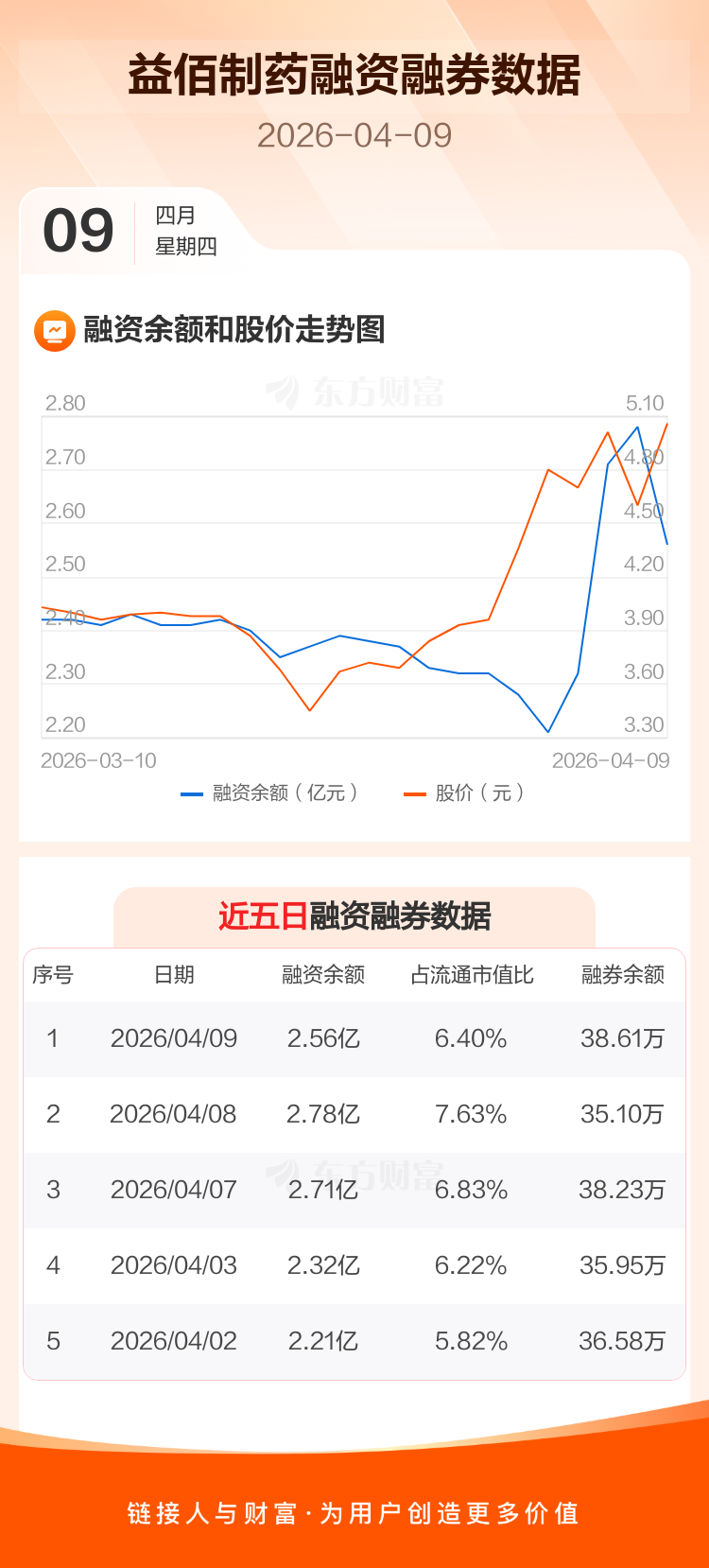 交易所最新数据显示,益佰制药于2026年4月9日获融资买入7060.08万元,融资偿还9212.57万元,当日融资净偿还2152.49万元。目前,该股融资余额2.56亿,占流通市值比例为6.40%。