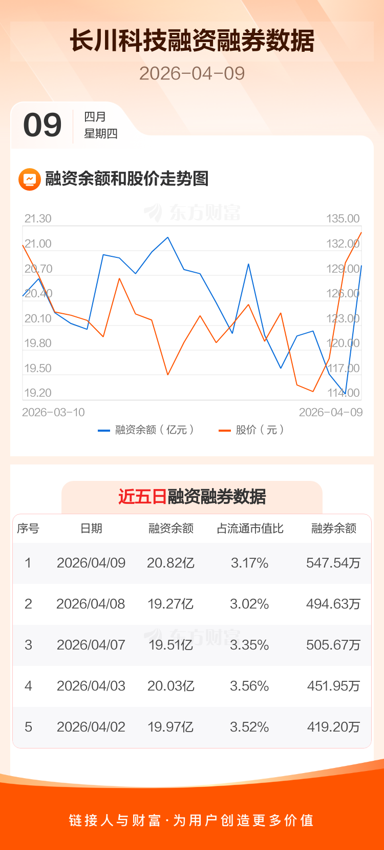 交易所最新数据显示,长川科技于2026年4月9日获融资买入4.01亿元,融资偿还2.45亿元,当日融资净买入1.55亿元。目前,该股融资余额20.82亿,占流通市值比例为3.17%。