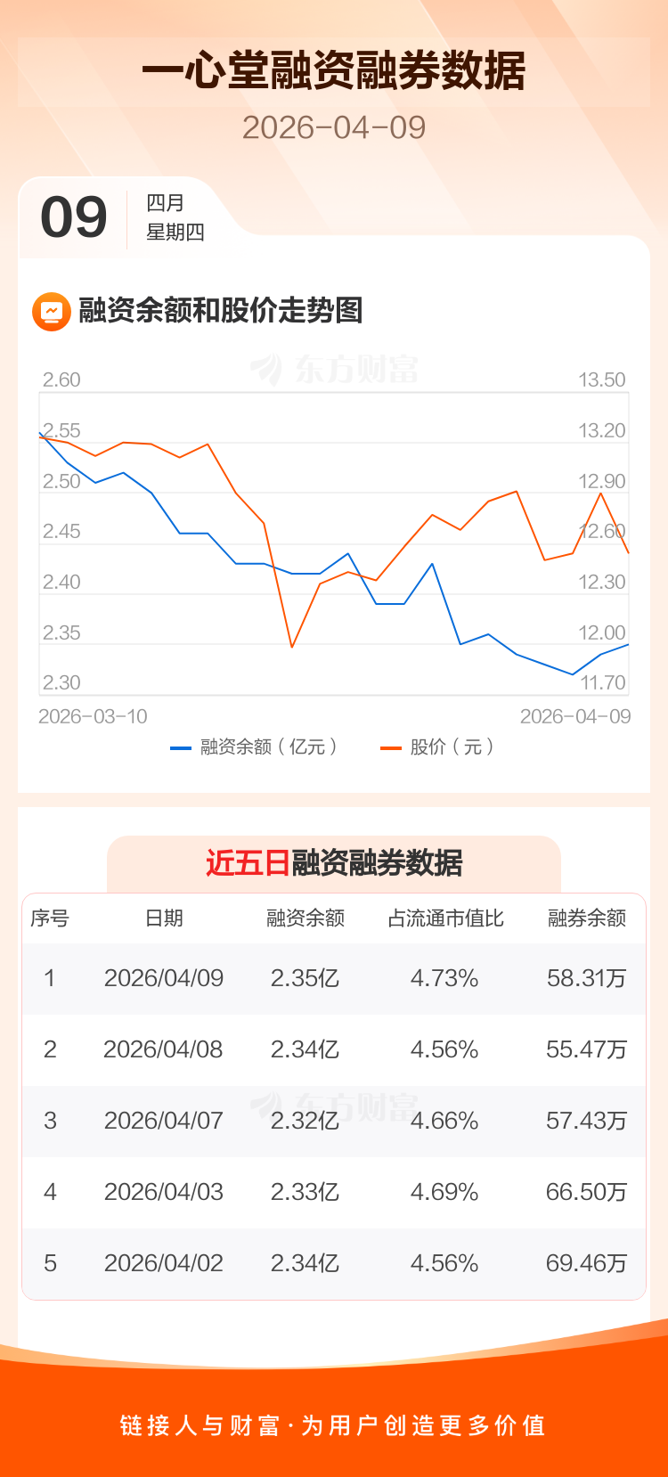 交易所最新数据显示,一心堂于2026年4月9日获融资买入766.00万元,融资偿还590.16万元,当日融资净买入175.84万元。目前,该股融资余额2.35亿,占流通市值比例为4.73%。