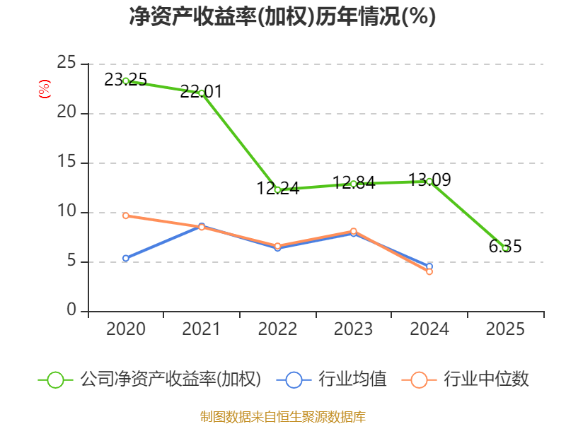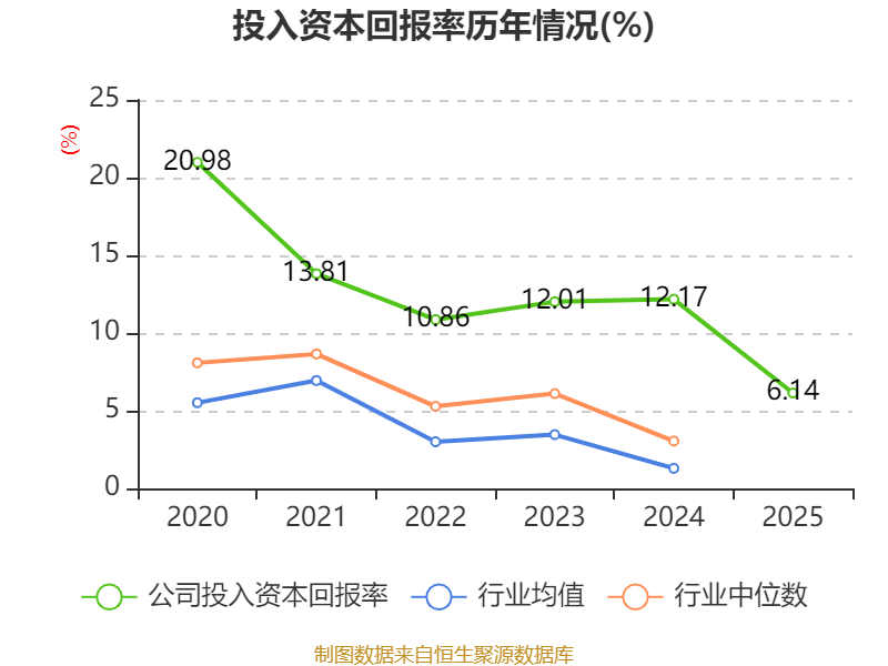 数据显示,2025年公司加权平均净资产收益率为6.35%,较上年同期下降6.74个百分点。公司2025年投入资本回报率为6.14%,较上年同期下降6.03个百分点。