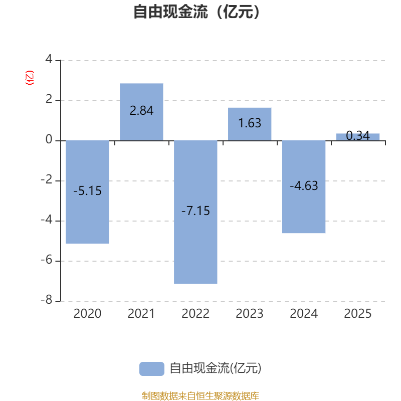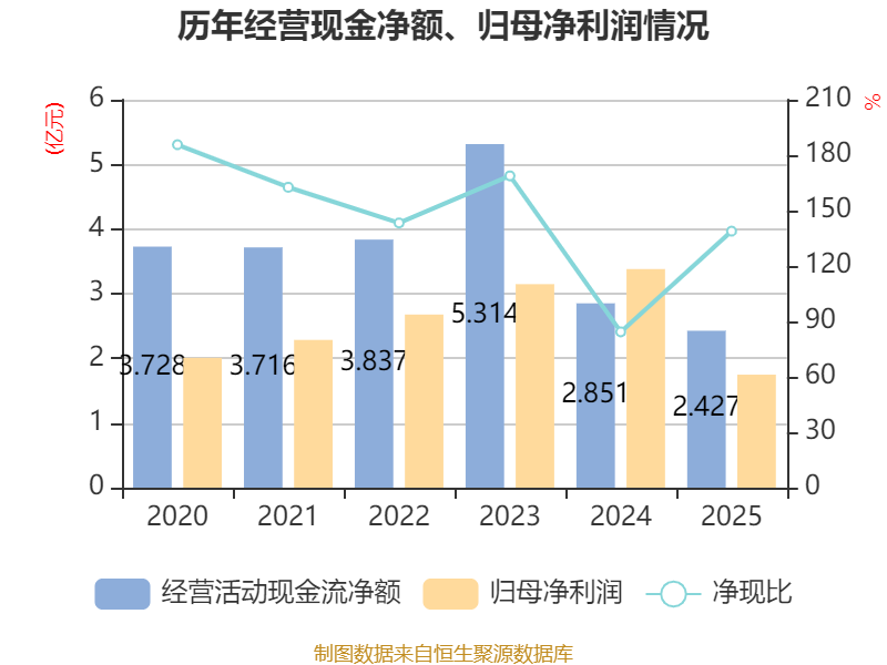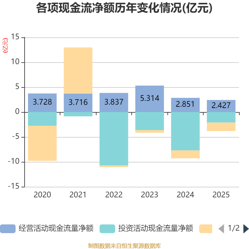 截至2025年,公司经营活动现金流净额为2.43亿元,同比下降14.86%;筹资活动现金流净额-1.7亿元,同比减少1046.31万元;投资活动现金流净额-2.1亿元,上年同期为-7.69亿元。