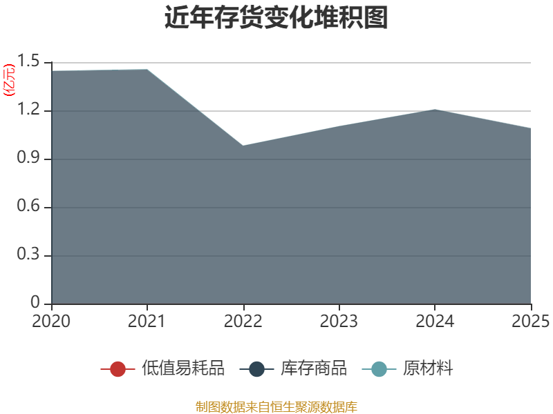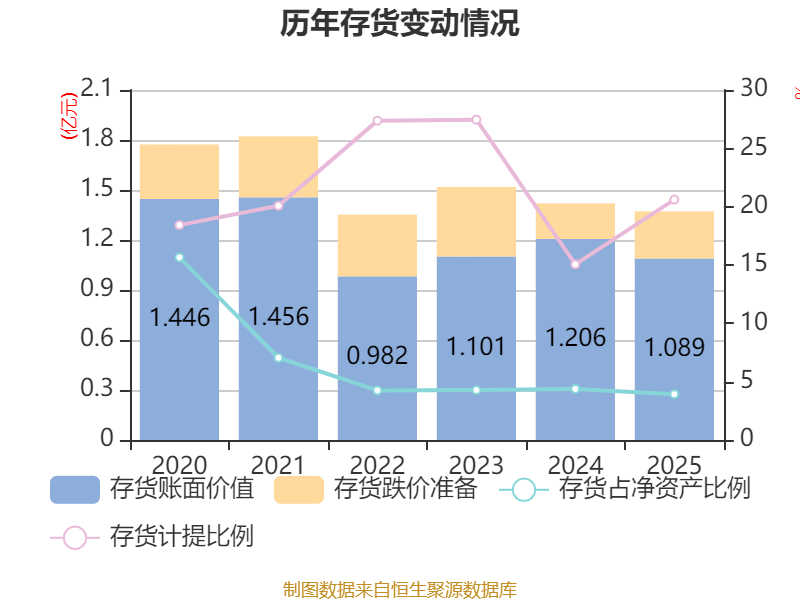 从存货变动来看,截至2025年末,公司存货账面价值为1.09亿元,占净资产的3.93%,较上年末减少1167.96万元。其中,存货跌价准备为2826.64万元,计提比例为20.61%。