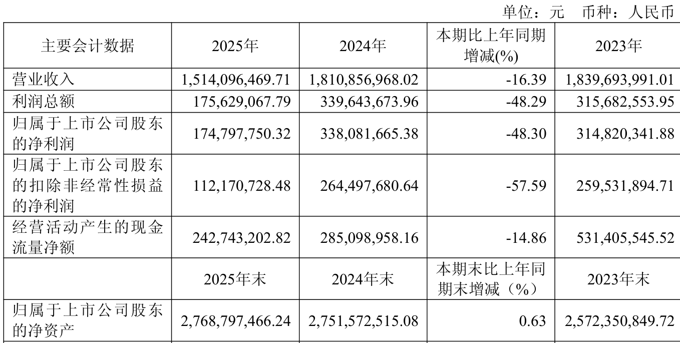 中证智能财讯内蒙新华(603230)4月10日披露2025年年度报告。2025年,公司实现营业总收入15.14亿元,同比下降16.39%;归母净利润1.75亿元,同比下降48.30%;扣非净利润1.12亿元,同比下降57.59%;经营活动产生的现金流量净额为2.43亿元,同比下降14.86%;报告期内,内蒙新华基本每股收益为0.49元,加权平均净资产收益率为6.35%。公司2025年度分配预案为:拟向全体股东每10股派现1.5元(含税)。