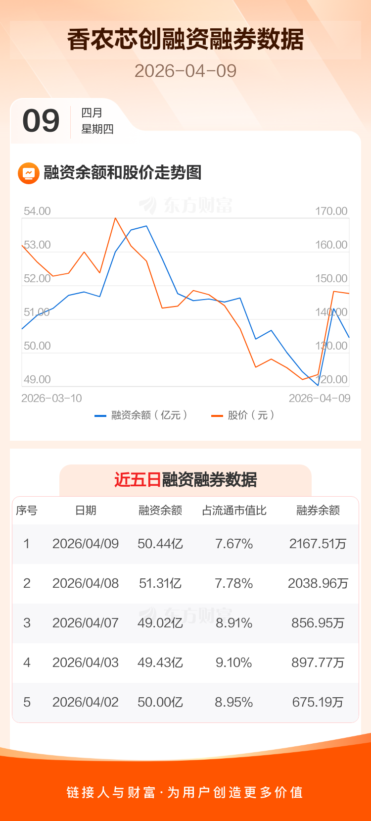 交易所最新数据显示,香农芯创于2026年4月9日获融资买入8.18亿元,融资偿还9.06亿元,当日融资净偿还8768.5万元。目前,该股融资余额50.44亿,占流通市值比例为7.67%。